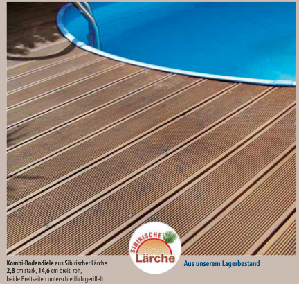 Für ein perfektes Ergebnis empfehlen wir eine fachgerechte Unterkonstruktion zur Vermeidung von Staunässe. Sibirische Lärche neigt bei Bewitterung zu einer edlen, silbergrauen Patina. Um den ursprünglichen Farbton zu erhalten, sollte die Terrasse regelmäßig mit einem passenden Terrassenöl gepflegt werden.